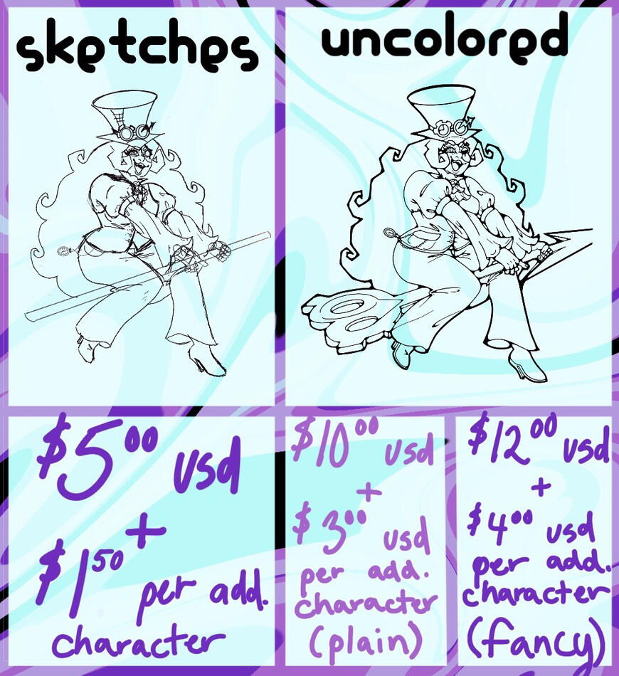 | Sketch, no color | $5 usd | +$1.50 usd |